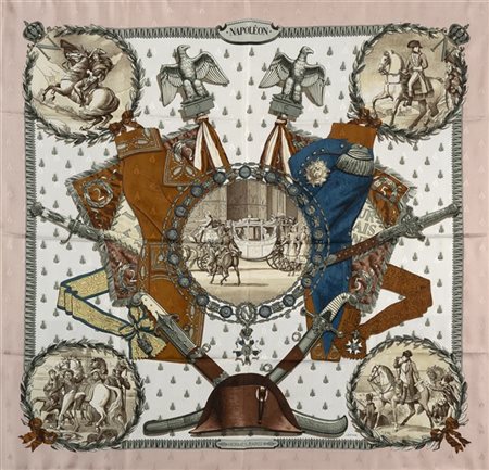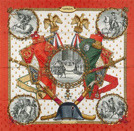 Foulard in seta jacquard "Napoléon", Philippe Ledoux 1963 fondo bianco bordo rosso (segni d'uso) -