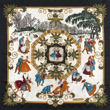 Foulard in seta jacquard "Joies d'Hiver", Joaquim Metz 1992, fondo bianco bordo nero (lievi difetti) -