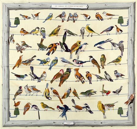 Foulard in seta "les Oiseaux des Champs et des Bois", Hugo Grygkar 1954 fondo crème bordo grigio perla (lievissimi difetti) -
