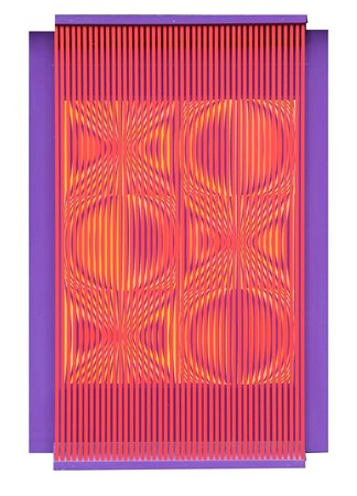 Lot 5 BIASI Alberto, Smorfie in rosso 2000 lamelle di PVC e tecnica mista su tavola cm. 53 x 36, . . Firma, data, titolo, numero di archivio "Alberto Biasi, 2000, Smorfie in rosso, OC/871";