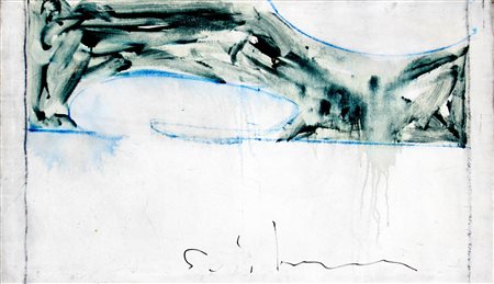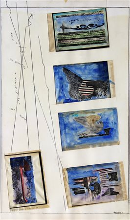 Lot 12 ANGELI Franco, Senza titolo 1983 collage, acquerello e matita su carta cm. 99 x 57, . Autentica rilasciata dall'Archivio Franco Angeli con n. P-221019/1581 in data 22/10/2019. Firma "Angeli" (in basso a destra)