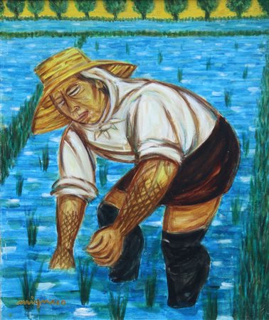Lot 16 MIGNECO Giuseppe, Mondina anni 60 (1960 - 1969) olio su tela cm. 55 x 45, N. C. Luciani "Migneco Catalogo generale Volume III", BonapArte Editrice, 1993, Milano, p. 122, ill. 2554. . Firma "Migneco" (in basso a destra)