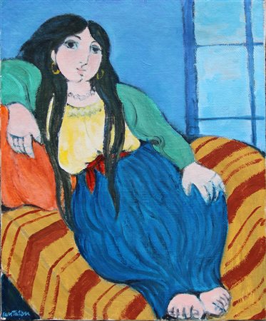 Lot 17 CANTATORE Domenico , Odalisca anni 80 (1980 - 1989) olio su tela cm. 50 x 40, . Autentica dell'artista su fotografia. Firma "Cantatore" (in basso a sinistra)