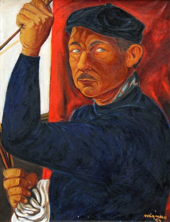 Lot 18 MIGNECO Giuseppe, Autoritratto 1954 olio su tela cm. 70 x 55, L. D'Eramo, "Migneco, catalogo generale, volume I", Bonaparte Editrice, Milano, 1986, p.170, ill.. . Firma, data "Migneco, 54" (in basso a destra)