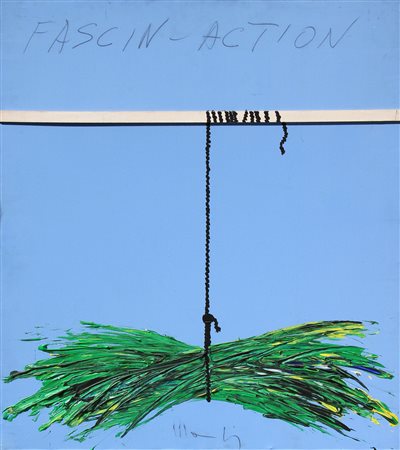 Lot 22 MONDINO Aldo, Fascin-Action anni 60 (1960 - 1969) tecnica mista su tela cm. 80 x 70, "Aldo Mondino. Catalogo generale vol. 1", a cura di Archivio Aldo Mondino, Allemandi editore, 2017, p. 175. Autentica dell'Archivio Aldo Mondino con numero 20140108153017 in data 12/03/2014. Titolo "Fascin-Action" (in alto al centro);