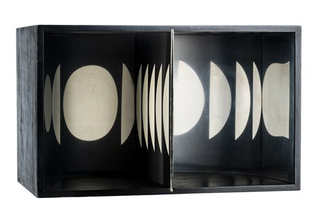 Multiplo, box di legno, metallo specchiante e 4 cartoni dipinti, cm. 37,5 x 60 x 36,5