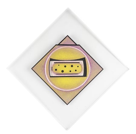 Tecnica mista, tela e inserti in plastica e ferro su tavola, cm. 33 x 33 x 2