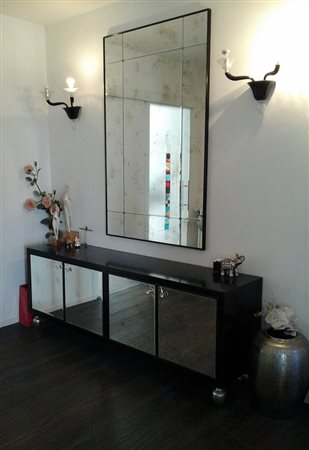 Lot 2 CREDENZA IN LEGNO CON SMALTO NERO E QUATTRO ANTE A SPECCHIO CON LIEVI DIFETTI CM.200X45 H.CM.74