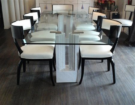 Lot 10 TAVOLO SIMON MODELLO DELFI DI CARLO SCARPA BY CASSINA PROGETTATO NEL 1969. Il tavolo Delfi col piano in vetro float è stato progettato da Carlo Scarpa, su disegno di Marcel Breuer. Il tavolo è composto da due basi monolitiche in marmo di Carrara bianco o in marmo nero Marquina. Il piano è fissato alle basi con piastre in ottone brunito incollate al vetro e appoggiate su feltri in lana cotta. Appoggio a terra con piedini in materiale plastico invisibili.