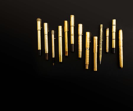 Lot 3 Lotto di 13 penne laminate e d'oro massiccio. Questo lotto comprende una selezione variegata di penne stilografiche e biro del periodo compreso tra 1920 e 1940 circa.