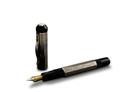 Il corpo ottagonale in argento sterling 925, riccamente impreziosito da decori in filigrana, riporta le incisioni artigianali eseguite a mano da otto Maestri, unitamente alla firma autografa dell'artigiano che ha realizzato la penna.