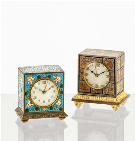 Lot 16 ZENITH - Coppia di svegliette carica manuale in metallo dorato con decori smaltati a motivi floreali e marini, anni '30. Marchio/Brand: Zenith