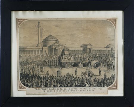 Lot 3 ANONIMO Trasporto delle ossa dei martiri bresciani del 1849. Stampa. Cm 60,00 x 44,00. Titolo e dedica in basso al centro. Cornice presente