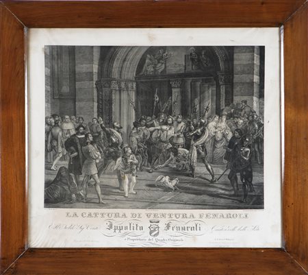 Lot 4 La cattura di Ventura Fenaroli. Stampa. Cm 61,00 x 52,00. Titolo in basso al centro; - editore P. Filippini - in basso a destra; dedica in basso al centro; da dipinto originale di Franc. Heyez. Cornice presente
