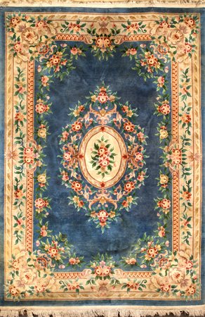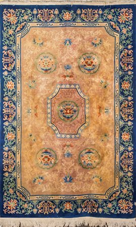 Lot 2 Tappeto cinese fondo beige a ramages vegetali ton sur ton; bordura blu con composizioni floreali policrome alternate a motivi stilizzati. Piccolo taglio lungo la bordura cm 184x282