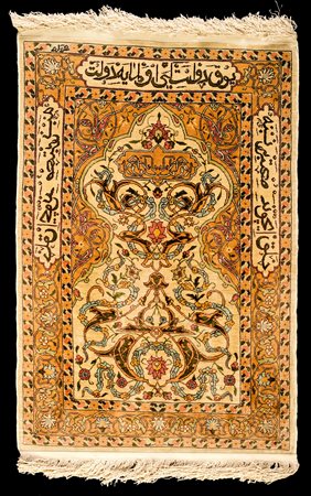 Lot 4 Piccola preghiera di Herekè con trama e vello in seta extra fine, Turchia Anni Settanta con annodatura a mano e fitta decorazione a motivi vegetali e fiori; tre iscrizioni incorniciano la mihrab cm 75x51