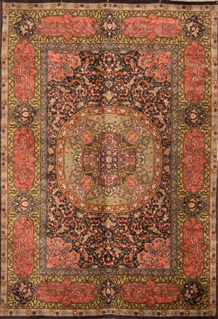Lot 5 Tappeto persiano Khorassan con fitta decorazione a motivi naturalistici e iscrizioni entro cartigli disposti lungo la cornice principale cm 235x160