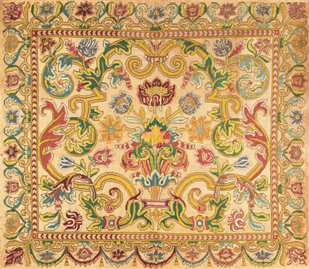 Lot 1 Tappeto fondo azzurro con grande medaglione floreale centrale racchiuso da bordure a tralci fioriti cm 310x215