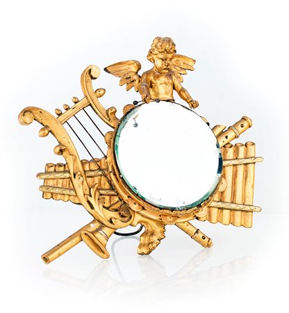 Lot 9 Specchio da tavolo in legno dorato in forma di trofeo di strumenti musicali, sormontato da una figura scultorea di amorino. Rotture cm 32x36