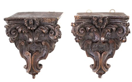 Lot 10 Coppia di mensoline a goccia in legno intagliato, XVII secolo caratterizzate da rilievi vegetali cm 23x20x17