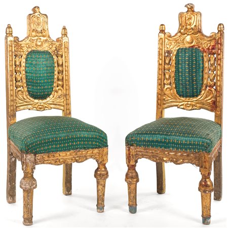 Lot 11 Coppia di sedie in legno dorato XIX secolo. con alti schienali e sedili imbottiti, gambe squadrate cm 122x52x50