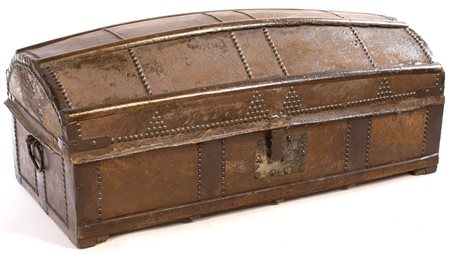 Lot 13 Antico cassone nuziale in legno con rivestimento in cuoio coperchio convesso caratterizzato da nervature e piccole borchie in metallo cm 44x110x50
