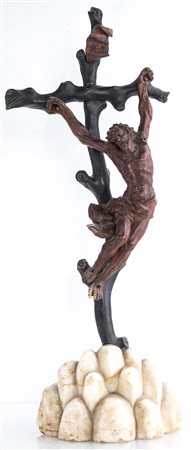 Lot 14 Cristo crocifisso in legno, Roma XVII secolo su croce lignea in forma di tronco d'albero su base in scagliola modellata a simulare colli cm 64x25x14