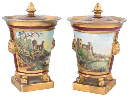 Lot 18 Coppia di vasi in porcellana d'epoca Impero con coperchio di forma conica su piedi ferini e base squadrata, sono decorati da belle vedute arcadiche policrome su fondo rosso amaranto con profili dorati; mascheroni ferini in rilievo completano la decorazione cm 21x14