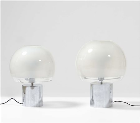 Lot 145 Luigi Caccia Dominioni, Due lampade da tavolo mod. LTA6 Porcino con struttura in ottone nichelato e diffusore in vetro parzialmente satinato., Prod. Azucena, Italia, 1967, W. 48 - D. 48 - H. 66 Cm, Bibliografia, G. Gramigna, Repertorio del design italiano 1950-2000, p. 130, Allemandi, 2003.
