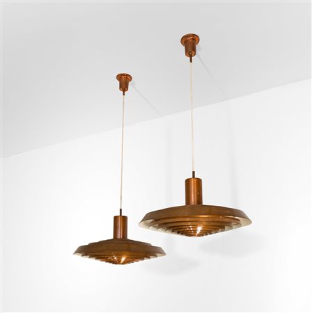 Lot 147 Poul Henningsen, Due lampade a sospensione con struttura in ottone ramato., Prod. Louis Poulsen, Danimarca, 1958, W. 42 - D. 42 - H. 95 Cm