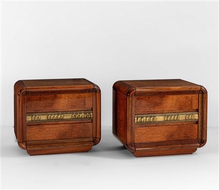 Lot 150 Luciano Frigerio, Coppia di comodini mod. Ilaria, struttura in legno massello e rivestimenti in radica. Scultura in fusione di bronzo., Prod. Frigerio di Desio, Italia, 1970 ca., W. 62 - D. 40 - H. 51 cm, Bibliografia, Catalogo originale di produzione.