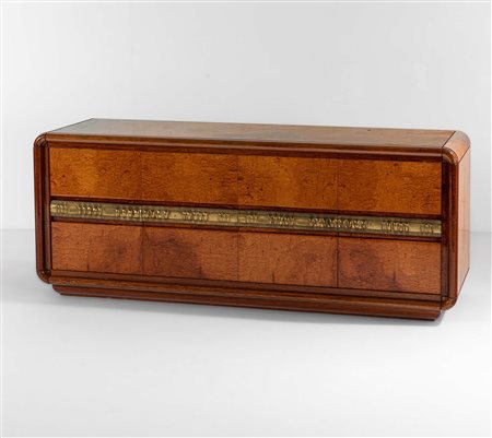 Lot 151 Luciano Frigerio, Mobile contenitore mod. Ilaria, struttura in legno e rivestimenti in radica. Scultura in fusione di bronzo., Prod. Frigerio di Desio, Italia, 1970 ca., W. 173 - D. 56 - H. 73 cm, Bibliografia, Catalogo originale di produzione.