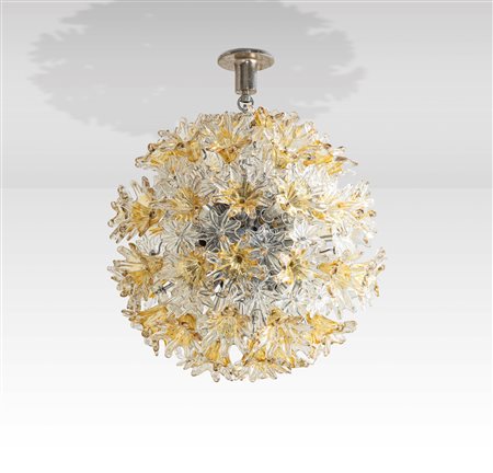 Lot 152 Toni Zuccheri, Lampada a sospensione mod. Esprit con struttura in metallo cromato ed elementi diffusori in vetro di Murano., Prod. Venini, Italia, 1970 ca., W. 60 - D. 60 - H. 72 cm, Bibliografia, F. Deboni, Venini, p. 70, Allemandi, 2007