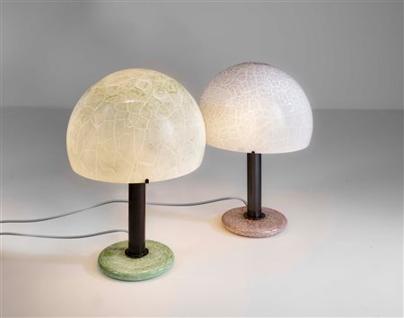Lot 153 Ludovico Diaz de Santillana, Due lampade da tavolo delle serie Alabastro con struttura in ottone laccato., Base e diffusore in vetro di Murano., Prod. Venini, Italia, 1970 ca., W. 40 - D. 40 - H. 58 cm, Bibliografia, F. Deboni, Venini Glass: Its history, artists and techniques, p. 247, Volume 1, Allemandi, 2007