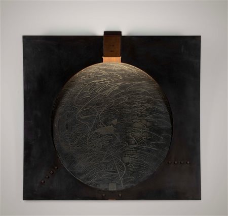 Lot 155 Nerone Ceccareli e Giancarlo Patuzzi - NP2, Pannello luminoso da parete mod. C3 104 LZ in metallo laccato, con incisione su zinco e particolari in rame., Firma originale, Prod. NP2, Italia, 1970 ca., W. 90 - D. 11 - H. 103 cm