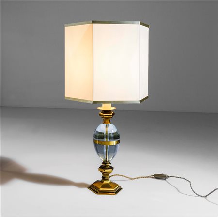 Lot 160 Gabriella Crespi, Lampada da tavolo con struttura in ottone e cristallo. Paralume in tessuto., Firma incussa., Prod. Italia, 1970 ca., W. 29 - D. 29 - H. 64 cm