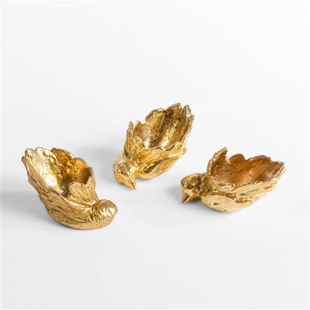 Lot 162 Gabriella Crespi, Tre portacandele della serie gocce d'oro in bronzo dorato creato con la tecnica della cera persa., Firma incussa., Prod. Italia, 1970 ca., W. 12 - D. 6 - H. 4 cm, Bibliografia , (a cura di) C. Cunacchia, Gabriella Crespi, Il segno e lo spirito, pp. 117, 124, 125, 132, Mondadori Electa, 2011.