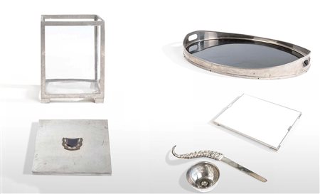 Lot 164 Gabriella Crespi, Set di oggetti da scrivania comprensivo di un vassoio in metallo laccato nero, un vassoio in metallo laccato bianco, un vaso, una scatola, un tagliacarte e una coppetta portaoggetti., W. 60 - D. 45 - H. 7 Cm
