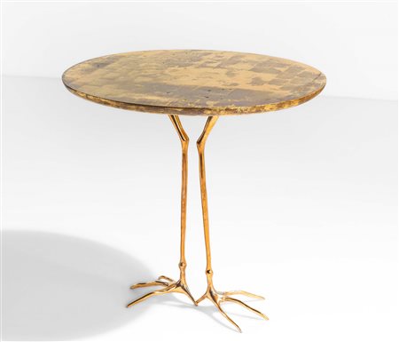 Lot 168 Meret Oppenheim, Tavolo occasionale mod. Traccia struttura in fusione di bronzo dorato e piano in legno foglia oro. Collezione Ultramobile., Prod. Italia, 1980 ca., W. 67 - D. 53 - H. 65 cm, Bibliografia, Fondazione Scientifica Querini Stampalia, Dino Gavina, collezioni emblematiche del moderno dal 1950 al 1992, p. 83, Jaca Book, 1992.