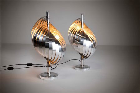 Lot 169 Henri Mathieu, Coppia di lampade da tavolo con struttura in acciaio ed alluminio., Prod. Francia, 1970 ca., W. 32 - D. 36 - H. 60 cm
