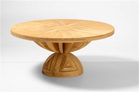 Lot 171 Mario Ceroli, Tavolo mod. la Rosa dei Venti con struttura in legno e piano decorato a intarsio. , Marchio a fuoco., Prod. Poltronova, Italia, 1973, W. 166 - D. 166 - H. 74 Cm, Bibliografia, G. Gramigna, Repertorio del design italiano 1950-2000, p. 214, Allemandi, 2003.