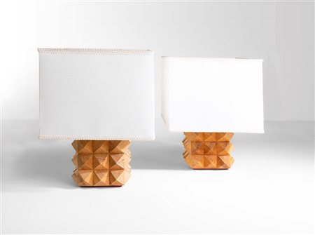Lot 173 Mario Ceroli, Due lampade da tavolo mod. Diamante con struttura in legno e paralume in tessuto. , Marchio originale., Prod. Italia, 1980 ca., W. 47 - D. 47 - H. 60 cm
