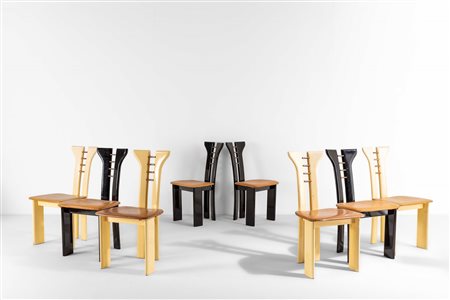 Lot 177 Pierre Cardin (nello stile di), Set di otto sedie con struttura in legno laccato e legno in diverse essenza. Rivestimenti della seduta in skai., Prod. Italia, 1960 ca., W. 48 - D. 44 - H. 90 Cm