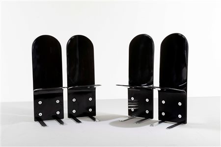 Lot 179 Luigi Saccardo, Quattro sedie mod. Pellicano con struttura in compensato curvato laccato e metallo., Prod. Arrmet, Italia, 1970 ca., W. 38 - D. 44 - H. 110 Cm, Bibliografia, Domus 555, febbraio 1976.