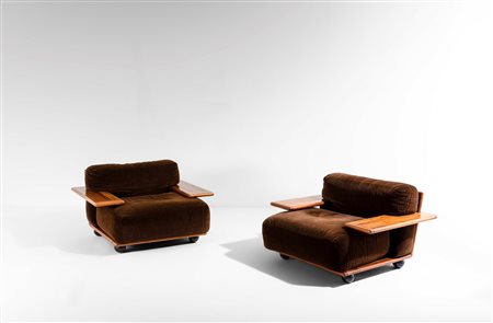 Lot 182 Mario Bellini, Due poltrone mod. Pianura con struttura in legno e rivestimenti in tessuto. Sostegni in gomma., Prod. Cassina, Italia, 1970 ca., Modulo singolo: cm 90x80x58; Tavolo basso: cm 80x80x12, Bibliografia, G. Gramigna, Repertorio del design italiano 1950-2000, p. 79, Allemandi, 2003.