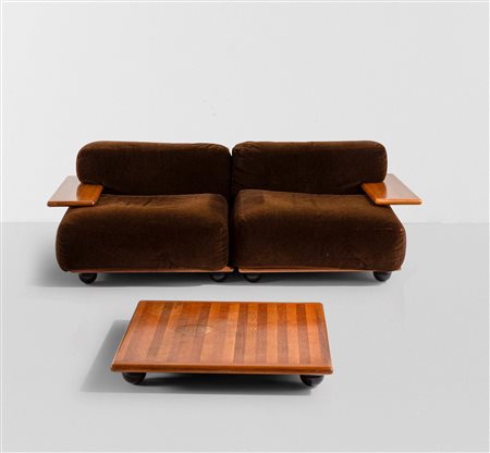 Lot 183 Mario Bellini, Divano a due moduli e tavolo basso mod. Pianura. Struttura in legno e rivestimenti in tessuto. Sostegni in gomma. , Prod. Cassina, Italia, 1970 ca., Modulo singolo: cm 90x80x58; Tavolino: cm 80x80x12, Bibliografia, G. Gramigna, Repertorio del design italiano 1950-2000, p. 79, Allemandi, 2003.