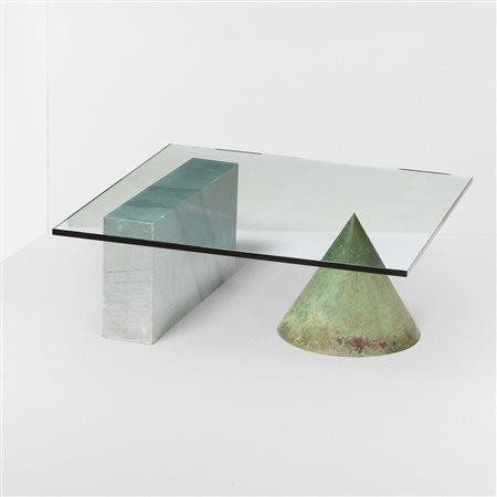 Lot 185 Lella e Massimo Vignelli, Tavolo basso mod. Kono con piano in cristallo molato e sostegni in marmo e rame., Prod. Casigliani, Italia, 1980 ca., W. 99 - D. 99 - H. 37 cm, Bibliografia , G. Gramigna, Repertorio del design italiano 1950-2000, p. 266, Allemandi, 2003.