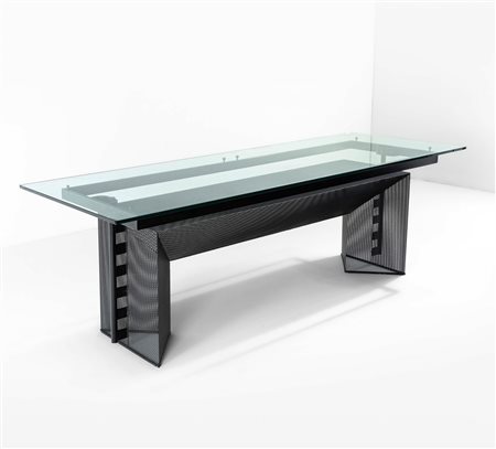 Lot 189 Mario Botta, Grande tavolo mod. Tesi con struttura in metallo. laccato e traforato e piano in cristallo molato., Prod. Alias, Italia, 1986, W. 240 - D. 86 - H. 74 cm, Bibliografia , G. Gramigna, Repertorio del design italiano 1950-2000, p. 83, Allemandi, 2003.