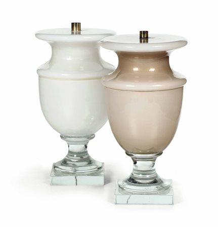 Lot 2 Coppia di lampade "Maurice" in vetro soffiato, color bianco lattimo e beige fumé, in vetro di Murano modello esclusivo eseguito dalla Vetreria Salviati, H. 47 cm, 47