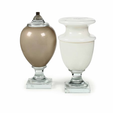 Lot 3 Due lampade: modello "Maurice" in bianco lattimo e modello "Uovo" in beige fumé, in vetro di Murano modello esclusivo eseguito dalla Vetreria Salviati, altezze cm 52 e cm 50
